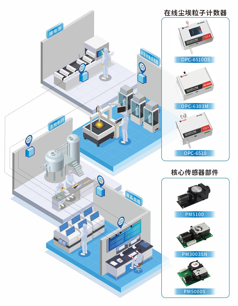K8凯发引领业界光电基于12年光散射技术的研究与创新,推出了在线尘埃粒子计数器OPC-6500F、OPC-6303M和OPC-6510,以及核心零部件激光尘埃粒子计数传感器PM5000S、PM3003NS和PM5100,可广泛应用于百级、千级、万级、十万级等洁净室环境。